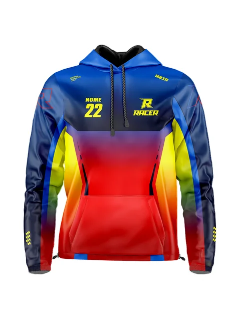 O agasalho é fabricado com tecido chimpa com peluciado interno, capuz com tecido peluciado interno microsoft, que garante o conforto e pro ajuste do capuz tem cordão e ponteira. Perfeito para dias mais frescos sem deixar de mostrar sua identidade de piloto. Ótimo para te acompanhar nos eventos off road. Com grafismos sublimados, o agasalho possibilita que a durabilidade de uso seja elevada, mesmo após o uso intenso e após várias lavagens.