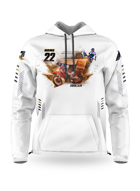 O agasalho é fabricado com tecido chimpa com peluciado interno, capuz com tecido peluciado interno microsoft, que garante o conforto e pro ajuste do capuz tem cordão e ponteira. Perfeito para dias mais frescos sem deixar de mostrar sua identidade de piloto. Ótimo para te acompanhar nos eventos off road. Com grafismos sublimados, o agasalho possibilita que a durabilidade de uso seja elevada, mesmo após o uso intenso e após várias lavagens.